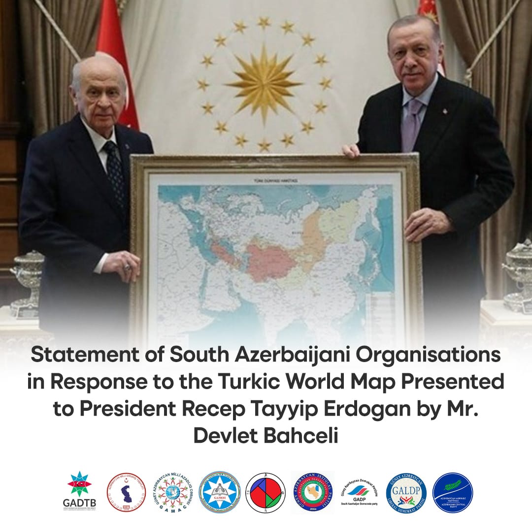 We are writing on behalf of South Azerbaijani Organisations listed below this statement, in response to the Turkic World Map. This map was designed and gifted to Mr President by MHP Chairman Mr Devlet BAHCELI in his visit to the Presidential Complex of Turkey. The images that were taken of both politicians highlighting the Turkic World Map were featured in the Turkish World and world press.