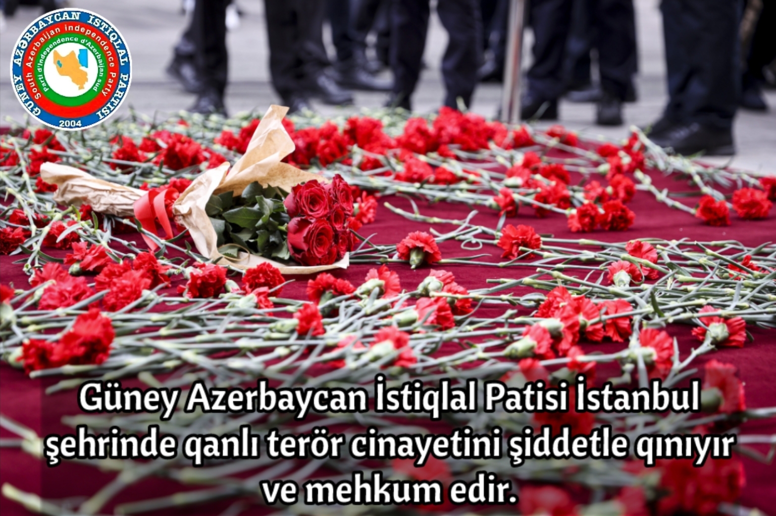 Güney Azerbaycan İstiqlal Patisi qardaş ülke Türkiye’nin İstanbul şehrinde PKK/PYD/YPG’nin eli ile töretdiği qanlı terör cinayetini ve arxasında olan gücleri şiddetle qınıyır ve mehkum edir. Bu terör saldırısında canını elden verenlerin ailesine baş sağlığı diliyir, yaralılara acil şifa arzılıyırız. İran işqalına olan Güney Azerbaycan Türk milleti geçmiş yüz ilde Kürd yayılmacılığı prosesinde defelerce Kürd terörcülüğüne maruz olmuşdur. Biz, Güney Azerbaycan Türk milleti olaraq, Türkiye devletinden bölgemizde Kürd yayılmacılığına ve terörcülüğüne son vermesini istiyirik. Bu barışcıl ve haqlı yolda her zaman her yerde qardaş Türkiye devletinin yanındayıq. Başımız sağ olsun.